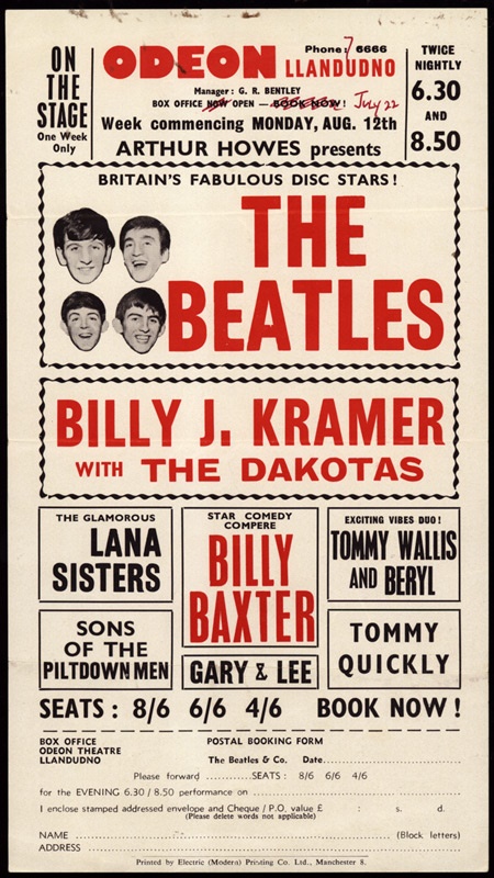 The Beatles had 2 week-long gigs at the Odeon Theatre in Llandudno, Wales during the summer of '64. The first was September 22-27 and though this handbill is for the 2nd gig, August 12-17, it apparently was secured by a fan who attended the former since "July 22" is noted in red pen at the top of the page. This red, black and white handbill is quite rare as it is one of the last examples of the Beatles sharing a bill with other acts, in this case Billy J. Kramer & the Dakotas, Billy Baxter and the inimitable Tommy Quickly. NRMT w/ nearly indistinguishable fold marks.