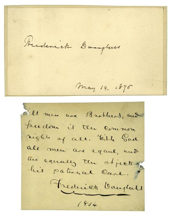 One of the foremost leaders of the abolitionist movement, Frederick Douglass provided a powerful voice for human rights during the 19th century. Offered is a pair of Douglas autographs, one being a remarkable signed quotation penned by the Civil Rights champion in 1854, a full six years before the start of the Civil War. The quote resides on a 4 x 3.5" section of paper, where Douglass has scripted the words, "All men are Brothers, and freedom is the common might of all. With God all men are equal, and are equally the objects of his paternal care. Frederick Douglass 1854". The importance of this piece cannot be overstated, as it is difficult to imagine a quote which better embodies the spirit of Frederick Douglass and all for which he fought.The second autograph is a beautiful black ink signature penned on a 5.25 x 3" section of paper and dated "May 19, 1876". Both pieces are affixed to a larger sheet of heavy stock paper, at the top of which someone has pasted a brief biography of Douglass. The signed quotation shows two small sections of paper loss at the edges, but otherwise reamains in EX-MT condition. The second signature is exceptionally clean and rates Near Mint (NM). The ink on each piece is bold and rates 9-10/10 in strength.