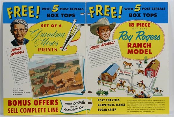 Striking full color advertising poster features Roy Rogers and famed artist Grandma Moses. This two sided cardboard poster promotes an offer from Post Cereals back in the 50's. For five box tops, you can order the official 18 piece Roy Rogers ranch model or a set of four Grandma Moses prints. Rogers is deemed "King of the Cowboys" and his smiling face is seen wearing a white cowboy hat. The ranch is the "Roy Rogers Double R Bar Ranch". A photo of Grandma Moses appears on the other side of the ad along with one of her prints. This lovely advertisement measures approximately 17" X 23" and is NRMT.