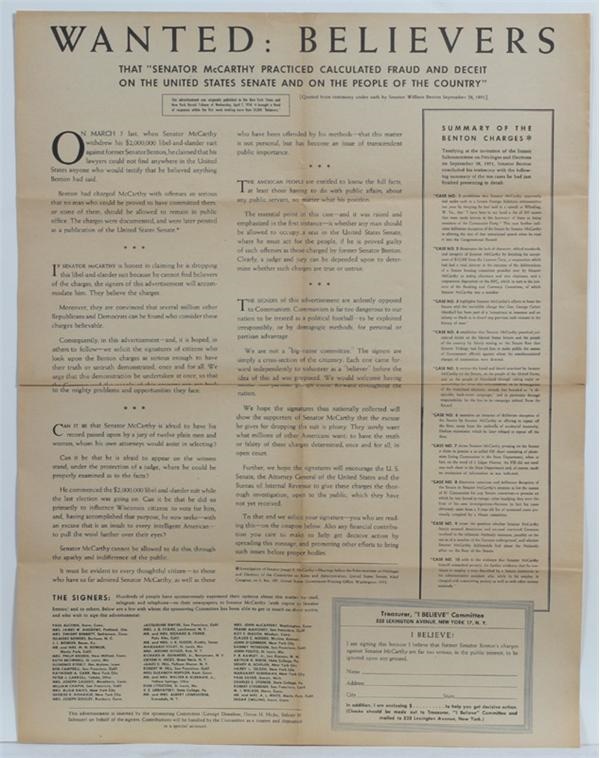 Exciting political broadside discusses the actions of Wisconsin Senator Joseph McCarthy in the early 50s and his anti-communist "crusade". The headline says: "Wanted: Believers That Senator McCarthy Practiced Calculated Fraud and Deceit on the United States Senate and on the People of the Country." A summary of the charges against McCarthy are listed on the right side of this poster that measures approximately 17" X 23" and a list of signees who sposered the broadside appear on the bottom. Some aging of the paper but overall, EX-MT.
