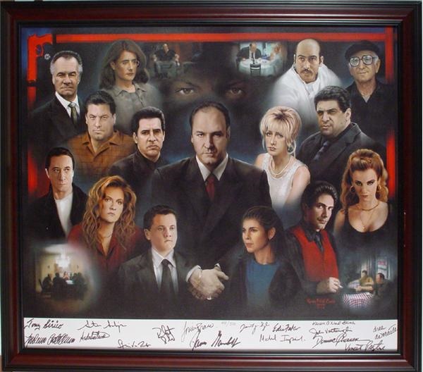 Beautiful Gilclee lithograph of the cast of "The Sopranos" was made by artist Karen O'Neil Ganci and signed by sixteen cast members of the hit HBO show. Cast members signing in bold black sharpie include James Gandolfini, Edie Falco, Steve Van Zandt, Jamie-Lynn Discala, Tony Sirico, Drea de Matteo, Dominic Chianese and many more. The painting is presented in a handsome dark wood frame measuring approximately 39" X 35" and comes with an LOA and photos of each of the 16 cast members signing the prints. The signatures average a spectacular "9.5" out of a possible 10 and the lithograph is NRMT. Badda-bing!