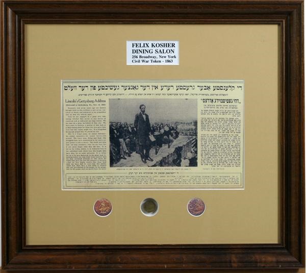 1863 Civil War food token from Felix Kosher Dining Salon measures approximately 1" in diameter and says, "Felix Kosher Dining Salon, 256 Broadway, New York" on one side with an Indian Head on the other side bearing the date, 1863. This incredibly rare token was actually given to Jewish soldiers in the Union Army when they visited New York. "Kosher" displayed in Hebrew characters. Above is a copy of Lincoln's Gettysburg Address written one side in English and the other in Yiddish (most likely taken from a contemporary Yiddish Newspaper). The coin is presented in a special frame so that both sides are visible while the Gettysburg address along with drawing of Lincoln delivering it are mounted above the coin and presented in an elegant brown frame measuring approximately 19x17". Coin is EX-MT.