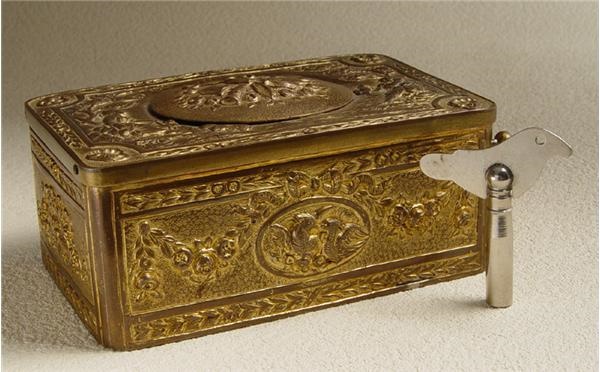 Fine silver-gilt, fully-engraved circa 1870s singing bird box with rare, "fusee" movement and the image of a violin covering the oval lid. Upon sliding a lever, a tiny blue bird, covered with hummingbird feathers, pops up, dances around, flaps its wings, moves its tail and turns its head all the while singing a very complex and realistic birdsong for approximately half a minute. These early birdboxes are a marvel of engineering and craftsmanship, utilizing a small bellows and whistle, a tiny articulated bird less than 1 inch long and eight cams to control sequentially the actions of the bird and its song. Quite possibly made by Charles Brugier, the creator of bird boxes of this kind, though any identifying marks on the bottom may have been rubbed off. 2.25 x 3.75" with almost no tarnishing of the thick, delicately engraved surface.