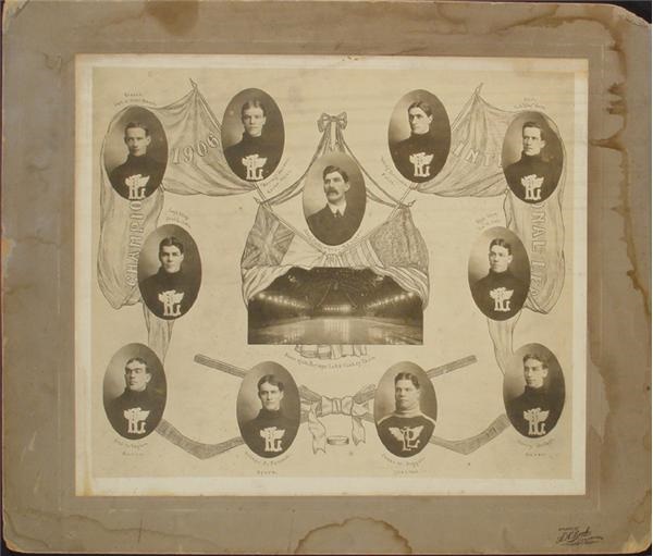 Vintage presentational cabinet photgraph of the 1905-06 Portage Lakes Lakers of the IHL, the world's first professional hockey team. What a roster! Riley Hern in net, Joe Hall, Fred "Cyclone" Taylor, Bruce Stuart... the best of the day, and all members of the Hockey Hall of Fame. Obviously, Portage Lakes finished the season as the Champions of the International League in 1906. Extremely scarce as these large cabinet photos were produced to be presented to the team members. Original photo image measures 14x17" with a matted size of 18x22". In very good condition with some staining.