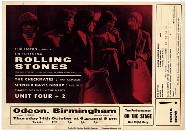 Flyer for the Stones' October 14, 1965 concert at the Odeon Theater in Birmingham, England, near the end of their 1965 Summer Tour. The flyer has a great group shot bathed in a raspberry hue and reads "Your only opportunity to see the Stones before Spring 1966". Contains a coupon to order tickets to the 2 shows and the rather unnecessary advice "Book Now!" Piece is 7 x 10" and immaculate.