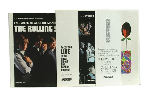 Fantastic slicks of 3 Stones album covers including their 1st LP, "The Rolling Stones (England's Newest Hitmakers) -- which was initially released without a name, as the band wanted people to ask for "the Rolling Stones album", thus the eventual title. The others are of their '66 "Got Live If You Want It" LP (with a flap reading "Record Live at Royal Albert Hall", though it was recorded at several venues) and the '67 "Flowers" LP (with a flap of hippie verse). Not a speck of damage on any, with the slick of the debut LP particuarly fine, not to mention historic.