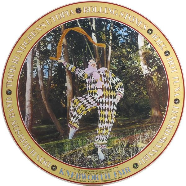 Beautiful circular concert advertisement promotes the Knebworth Fair Concert held in England in 1976. Other bands appearing include Lynard Skynard, 10cc, Hot Tuna and Todd Rundgren's Utopia. A harlequin clown is at the center of the poster wearing a brightly colored costume that is partially transparent. An 8" X 15" matted newspaper advertisement where tickets are on sale is also included in this collection. It advertises "All the Fun of The Fair" surrounded by two horses leaping and lists the many locations where tickets were available for the show. Both pieces are NRMT.