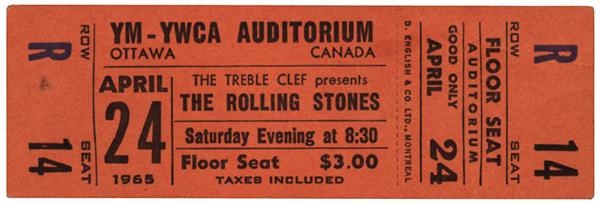Full ticket for the Rolling Stones at the YM-YWCA Auditorium in Ottawa on April 24, 1965. This is an early concert, before the bands release of "I can't get no Satisfaction" their first gold record. Ticket is has two creases, overall EX.