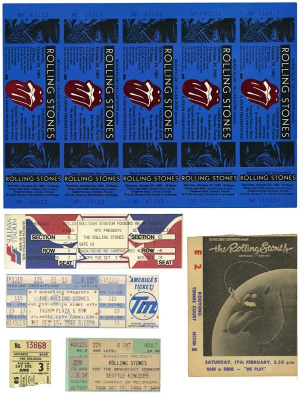 Interesting ticket lot includes an uncut sheet of pristine and beautiful blue tickets for October 24, 1981 at the Tangerine Bowl, Orlando, Fla. Also includes ticket stubs June 3rd, 1972 at Pine Coliseum, Australia Tour 1973, and Atlantic City, NJ on Dec 19, 1989, and Seattle Kingdom 1994. Also a full ticket for Foxboro MA Stadium for Oct 3, 1989 in NRMT condition.