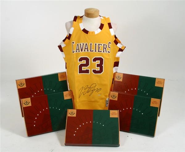 No rookie has made more of an impact on the NBA in recent years than Cavaliers sensation Lebron James. James signed each of these six beautiful Cavs gold and burgundy throwback jerseys in bold black sharpie as part of a limited edition. The six jerseys are numbered 6, 9, 10, 11, 16 and 17 out of 123. Signatures average "9.5" out of a possible 10. Each jersey is still in its original box and bears the UDA hologram. Mint.