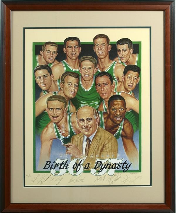 Beautiful limited edition prints featuring Red Auerbach and 11 members of the 1956-57 NBA Champion Boston Celtics titled, "Birth of a Dynasty." Each of the 11 players from this legendary team signed the print in pencil as did Auerbach. Signers include: Bill Russell, Bob Cousey, Bill Sharman, Tom Heinsohn and more. Signatures average "9" out of a possible 10. Only 57 of these limited edition signed prints were ever produced and we offer a considerable four, including numbers 32, 35, 42 and 49. Each is matted and presented in an elegant dark brown frame. NRMT overall.