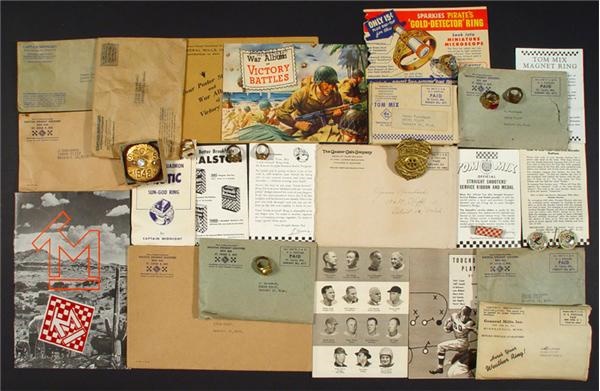 Remember all those special offers from the Golden Age of Radio? Were you collecting box tops and proofs of purchase to get your secret decoder ring? Here is an extensive collection of premium items from old radio shows of the 1940's. Many great items from Captain Midnight, Tom Mix and more. Includes many "secret" rings, code books, a sheriff's badge, medals, ribbons and the rules and regulations of the "Straightshooters Club". A booklet containing photos of the entire cast of "The Tom Mix Radio Show" is included along with a 1945 guide to winning World War II battles and two booklets about football written by Fritz Crisler and other college coaches. 10 of these items include the original mailers with return addresses from Captain Midnight, The Ralston Straight Shooters and Tom Mix. EX+.