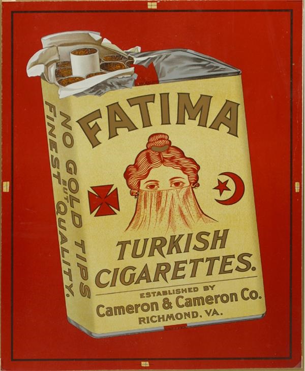Vintage cardboard advertising sign for Fatima Turkish cigarettes is one of the nicer ones we have ever come across. In exceptional condition and displaying bold beautiful graphics, the sign grades NRMT except for a light crease down the right side. Measures 13.75x17.5".