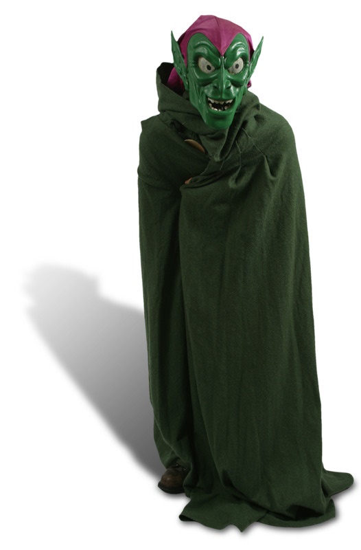 Arch-nemesis of Spider Man, the Green Goblin's costume consists of a green hard-rubber face mask in the character's impish likeness wearing a magenta scarf over his head, and a forest green cloak with a large metal clasp at the throat. The costume was used for promotional purposes in the 1960's by Marvel Entertainment and is offered in NRMT condition.