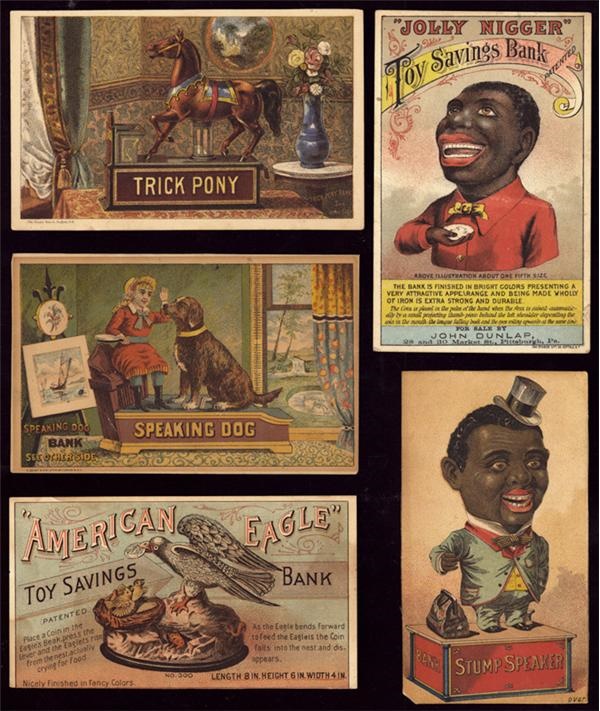 Vintage trading cards dating to the 1880's feature five different mechanical banks. The cards each measure approximately 5.5"X3.25" and are full color ornate paintings. Included are the Speaking Dog, Trick Pony, Stump Speaker, American Eagle and more. EX+.