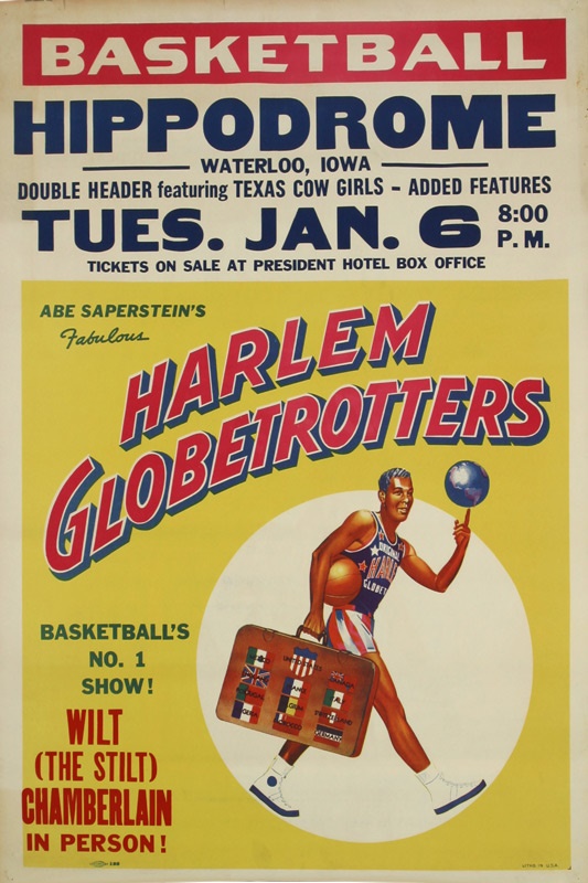 Offered is one of the rarest Harlem Globetrotters posters in existence. This oversized poster measures 41 x 28”. We know it was created during the 1959 season because it was the only year the young Wilt Chamberlain would suit up for the Globetrotters before making his NBA debut the following year. Original site poster advertises Wilt the Stilt as “Basketball’s No. 1 Show” and the Globetrotters appearance at the “Hippodrome, Waterloo, Iowa”, on, “Tues. Jan. 6”. Color is vivid and would look outstanding framed. Minor wear along top edge of poster. Grades EX to EX-MT.
