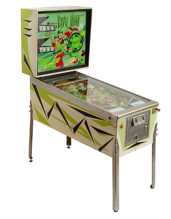 Ladies and Gentleman, the Bootles (sic)!!! This ultra-colorful vintage pinball machine was maufactured by Williams Electronics in 1966. Clearly, an unlicensed ( no NEMS) mimic of The "Fab Four". The Boys' are accurate down to the left handed bass player, "Mop Top" haircuts, collarless jackets and "Ya-Ya-Ya" slogan. In addition, "The Bootles" pinball machine features on the play-field, the satirical names of other 60s' groups such as "The Vultures" ( The Ventures) and "The Groaning Bones" (Rolling Stones). Beatles manager Brian Epstein gained a cease and desist order against Williams Electronics for copyright infringement. A low run of only 500 were manufactured and only 48 are known to still exist. One is rumored to be in the personal collection of Sir Paul McCartney. This vintage pinball machine is complete and all original. Back glass shows minor paint flaking in the lower right corner but is an awesome display piece. The playfield is EX-MT and shows average use wear. This rare beauty is in working condition and presents a super scarce piece of coin-operated Beatlemania .