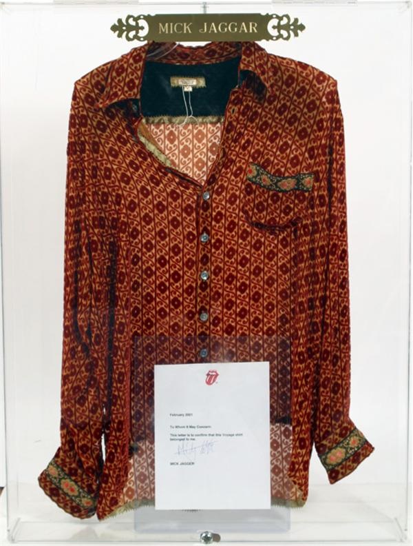 Mick Jagger clearly had a change of heart from the days when he sang "No colors anymore, I want to paint it black", at least in his choice of clothing to wear on stage. This Voyage shirt worn by the now geriatric rocker is a palette of bright and sunny maroon and gold, with black and red detailed antique patterns on the cuffs and pocket on the chest. The floral textured Velour shirt conveys a velvety yet masculine sense of rock and roll style, and as such a natural for the Stones frontman who attracts all eyes when on stage. Drop-needle stitching resembles plush corduroy, yet it is softer & drapes more fluidly. We think it would be a perfect thing to slip on if and when Mick ever does ride across the desert on a fine Arab charger. Shirt has the Voyage XL label and is hangered in a handsome Lucite case measuring 28 x 36 x 4". Comes with LOA from Jagger.