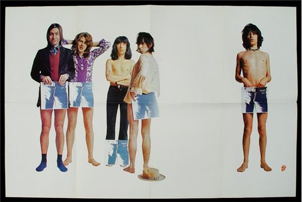 This promotional poster is a clever and "cheeky" variation of the common "Sticky Fingers" poster that usually features the famous "zip fly" album cover as the entire poster. This take has the 5 semi-unclad Stones each holding the cover strategically over their exposed private parts, Jagger, Watts & Taylor over their fronts, Richards the reverse cover "butt" over his own back side, & Wyman with the cover dropped over his ankles. Poster is 22 x 35" and NRMT.