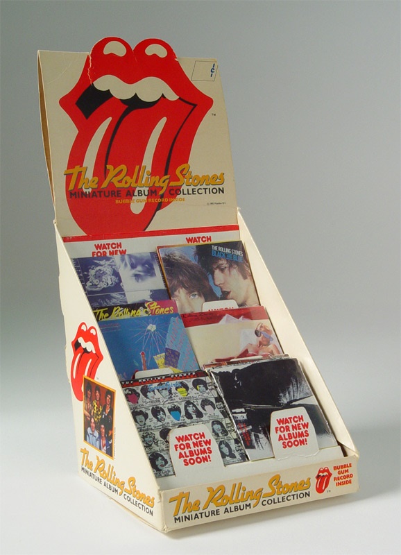 In '83 scale-model reproductions of the Stones' album covers were marketed as "collectibles" like baseball cards, with the "records" actually circular bubblegum pieces inside. They are indeed collectibles today for their very limited quantities. Counter display includes all 11 "albums" from this particular series including "Exile on Main Street", "It's Only Rock 'N Roll", "Tattoo You", "Still Life" and "Love you Live". Only "Some Girls" is opened and all pieces are NRMT as is the display.