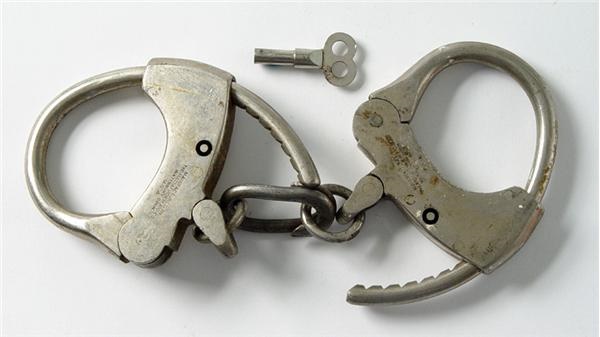 Single Lock handcuffs made by the Mattatuck Manufacturing Co. owned by The Great Houdini was one of his best props in his escape act, in which he would free himself from handcuffs, chains, ropes and straitjackets, often while hanging from a rope or suspended in water. Perhaps his most famous act, the Chinese Water Torture, saw him suspended upside-down in a locked glass and steel cabinet of water. The cuffs are certainly a daunting obstacle, yet Houdini could if need be unlock them even without the key, by applying just the right amount of pressure with his hand. The cast iron cuffs have the key in the lock, and the mechanism is fully operational. Like Houdini's collection of keys, he bequeathed the cuffs to his escape artist brother Theo, who performed under the name of Hardeen, with instructions to destroy them. Instead, he kept and later gave them to Sidney Radner, curator of the Houdini Museum in Las Vegas. The cuffs w/adjoining chain are EX with a smattering of nicks, scratches and white spots. They come with a LOA from Radner. Nonpareil Houdini artifact.