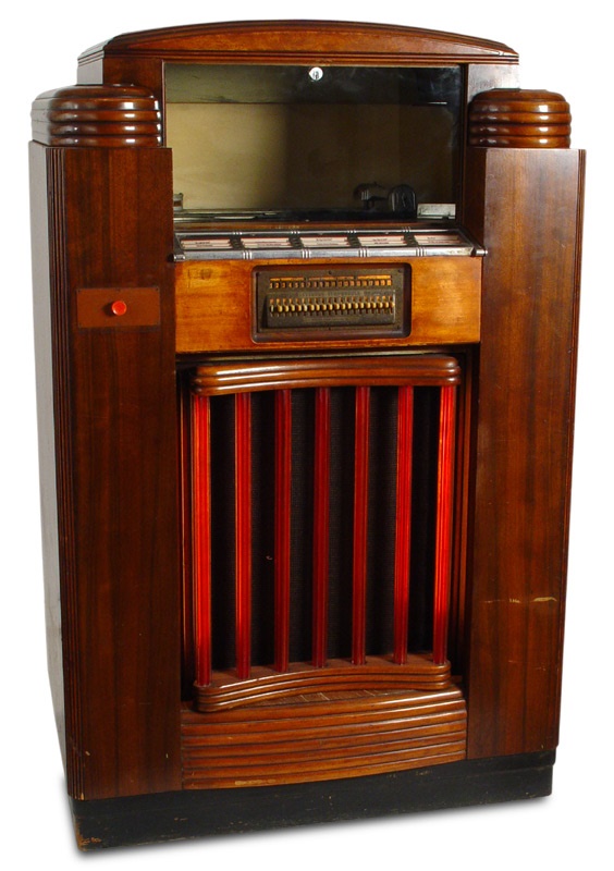 A rare treasure in juke box collecting. This beautiful art-deco style 20-record sliding tray machine with walnut veneer (78 RPM) is one of the last all-mechanical juke boxes to display the record changing mechanism behind a clear glass window. After 1937 the cabinets were drastically re-designed using opaque light-up plastics and record changers were always hidden from view. They just don't make 'em like they used to - these early Seeburg juke boxes possessed superior sound quality due to the use of a high output magnetic pickup. Among the 20 records in the machine: "Happy Holiday" & "Don't Let That Moon Getaway" (Bing Crosby); "Tell Me That You Love Me" (Tony Bennett); "My Guys Come Back", "After You've Gone", "A String of Pearls" & "My Blue Heaven" (Benny Goodman); "Someone" (Duke Ellington); "My Romance" (Frank Sinatra); "Blueberry Hill" (Louis Armstrong); "But She's My Buddy's Chick" (Nat King Cole). Juke box measures 55x35x23". Just serviced with new AMP wheels. In full working condition! EX