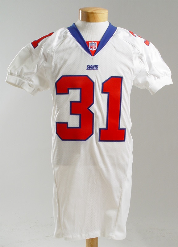 For eight seasons Jason Sehorn was the emotional leader of a young and dangerous NY secondary. Beautiful game-used jersey with his blazing red number “31”, huge on front and back as well as on both shoulders. Embroidered Nike logo on both sleeves. Official NFL patch below collar line on front. Manufacturer’s tag has been removed from the tail to enable the jersey being shortened. Collar tagging reads, “00-46.” Light but evident use.