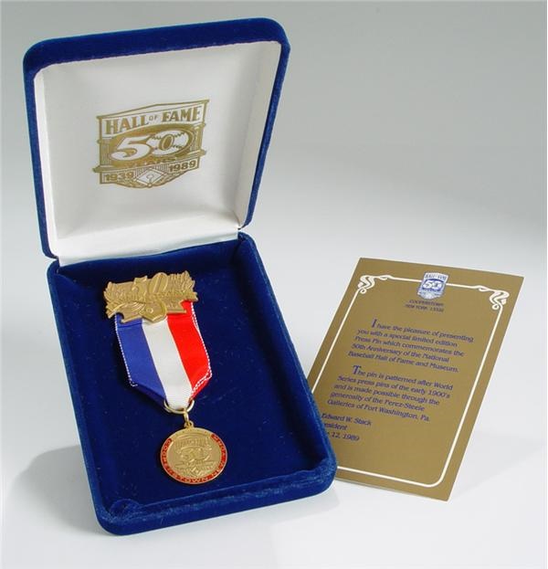 A "charming" limited edition Pin (#271/700) from Perez-Steele Galleries, commemorating the 50th Anniversary of the National Baseball Hall of Fame. Pin is patterned after World Series press pins of the early 1900's, a gold charm hanging from red, white & blue ribbon (measures 5"). Mint condition in original blue velvet case and ceritified mailing box.