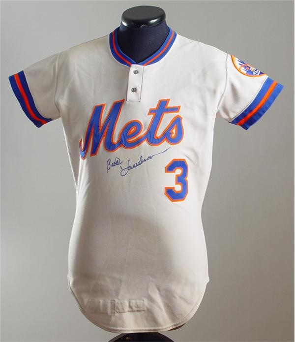 The scrappy shortstop electrified Shea with his gritty play and aggressive base running for over a decade. Here's his gray spring training , two-button, pullover jersey he wore right before he was traded to the Phillies March 28, 1978. It features blue on orange tackle twill "Mets 3" above his black sharpie signature on the chest and his number "3"in the same on the verso. The left sleeve is adorned with a circular "Mets" team logo patch while the inner front tail owns a "Rawlings [size] 38" tag, "Set 1 1978" flag tag and "38 37 78 3" chain-stitched stripe tag. Solid use throughout in the form of field markings are a true testament to the hustle and heart of this undersized star.