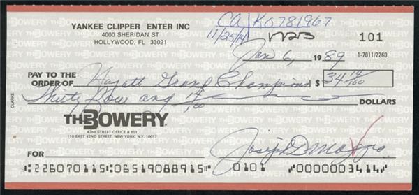 Business check from Yankee Clipper Enter Inc., dated January 6, 1989, signed by Joe DiMaggio in blue ink. The ink is bold and strong throughout with only minor breaks in the "J" of "Joe" and "gg" of DiMaggio. On the checks reverse are all official bank stampings some of which are visible on the face.