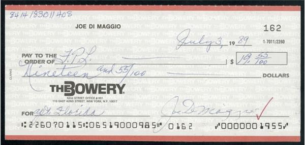 Personal check, dated August 1,1989, and signed by Joe DiMaggio in blue ink. The ink is bold and strong throughout with only minor breaks in the "J" of "Joe" and "gg" of DiMaggio. On the checks reverse are all official bank stampings some of which are visible on the face though none interfere with the signature.