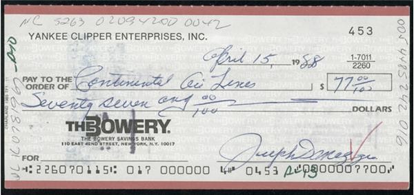 Business check from Yankee Clipper Enterprises, Inc., dated April 15, 1988, signed by Joe DiMaggio in blue ink. The ink is bold and strong throughout with only minor breaks in the "J" of "Joe" and "gg" of DiMaggio. On the checks reverse are all official bank stampings some of which are visible on the face.