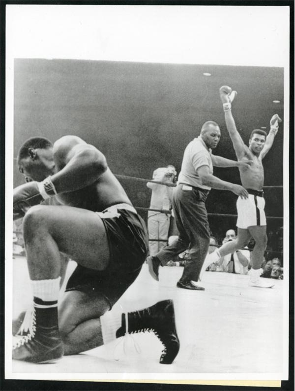 This B&W wireservice photo shows referee Joe Wolcott guiding Heavyweight Champion Cassius Clay to a neutral corner allowing Clay to retain his belt in what turned out to be a weird one-minute knockout of Sonny Liston on May 25, 1965 in Lewiston, Maine. Photo measures 7"x9".
