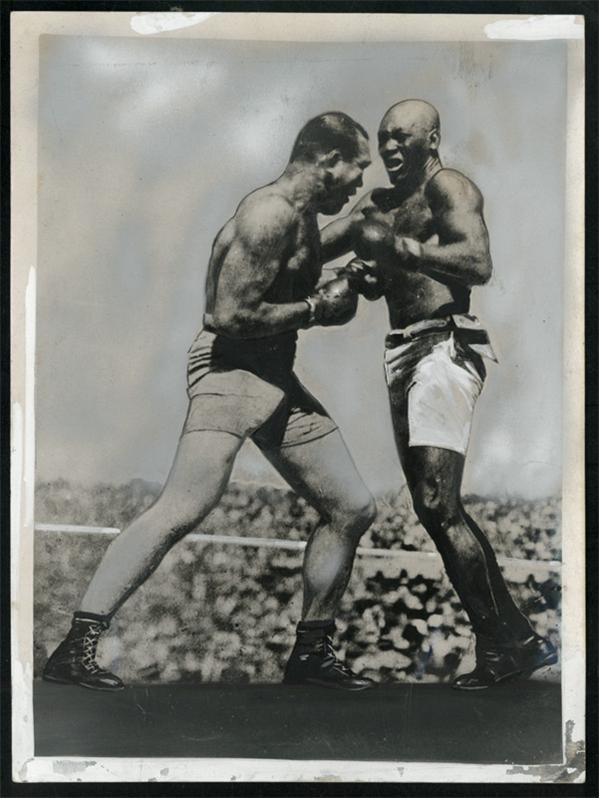 Inone the the most memorable fights in boxing history, Jack Johnson ( the first black Heavyweight champion in the history of the game) knocked out legendary former champion Jim Jeffries in round number 14. The fight was significant because Jeffries had reigned as Heavyweight Champ from (1899-1904 and retired undefeated) and Johnson was the first Black Heavyweight Champion. The photo is touched up and colorized and in EX condition.