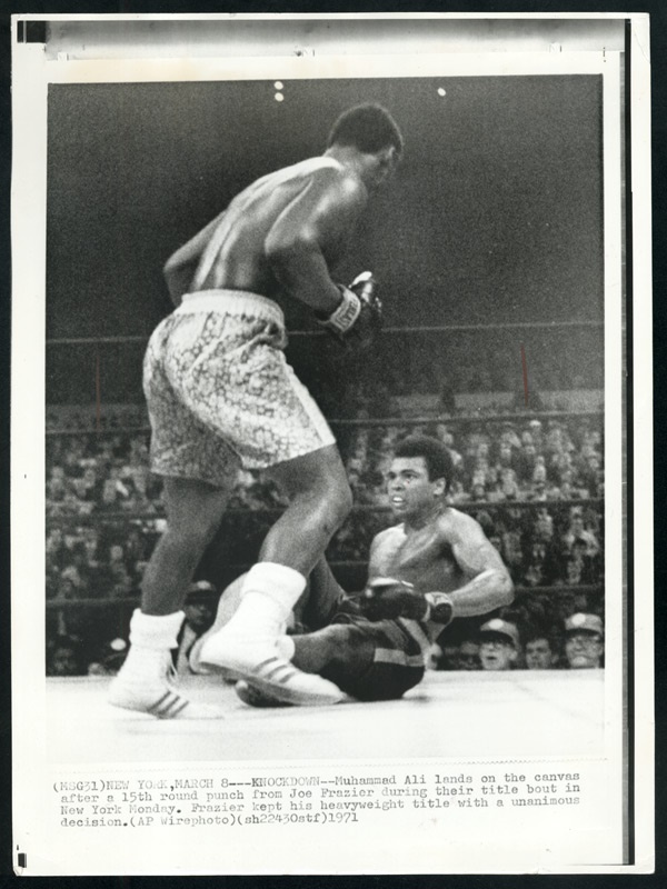 AP wirephoto from Ali vs Frazier, March 8, 1971 at Madison Square Garden in New York. Frazier scored a 15 round unanimous decision over Ali to retain the Heavyweight Title. Back of photo contains a stamp "Montreal Star MAR 9 1971" and various orange grease pencil notations .