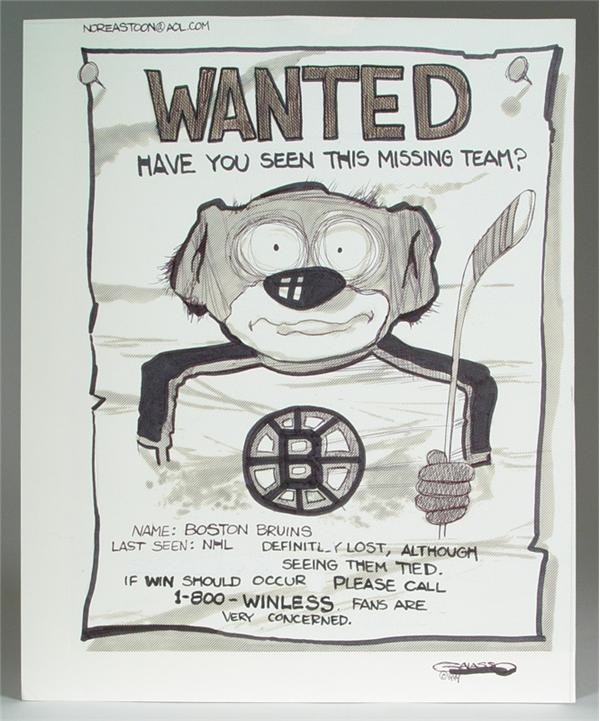 This is an original drawing from noted illustrator and cartoonist Frank Galasso. The topic is the fans concern with the play of a struggling Boston Bruins Hockey Team. Drawing is signed and is in MT condition.