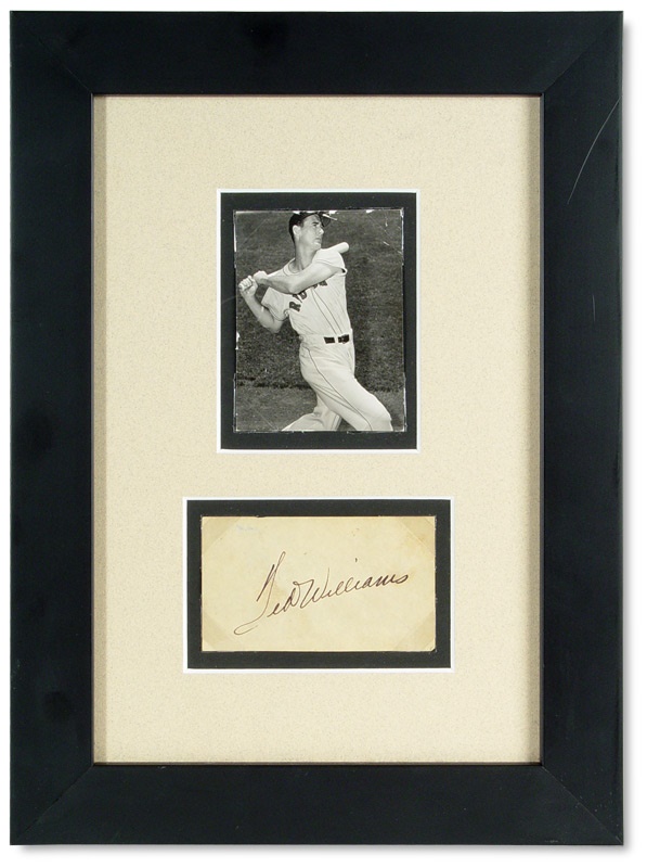 Ted Williams was one of the greatest hitter of All-Time. This amazing framed piece combines a vintage Black & White photo of "The Splendid Splinter" measuring 2 1/2" x 3 1/4" with an original vintage cut-out signature. Both pieces were obtained at the same time directly from the babysitter to Ted's two daughters. The cut-out signature rates a "9" out of a possible 10. The piece is framed in black with sand colored matting.