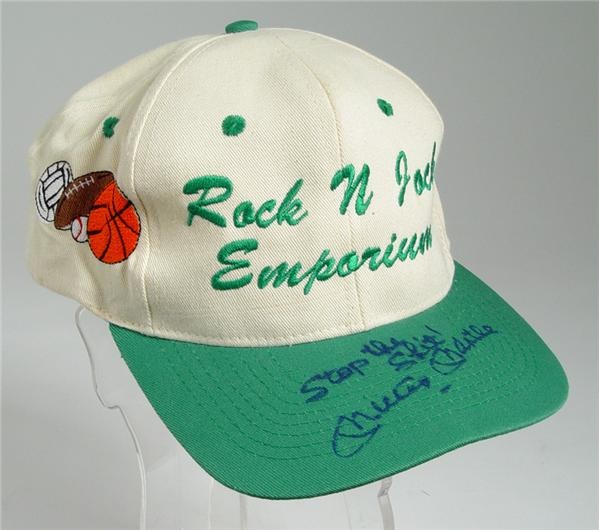 The Mick was the Elvis of the baseball set, making his mark in the decade when rock was born, and bridges sports and pop culture for a generation of Baby Boomers who revered him. Which makes this green and white "Rock N Rock Emporium" baseball cap -- a souvenir of MTV's celebrity softball games -- a natural and very cool place for his always coveted signature, turned here in blue sharpie on the green bill, grading an 8/10. However, Mantle may not have been as into rock and roll as his fans, as he wrote above his name "Stop the Shit!", though this may simply have been the typical Mantle salty wit at work, perhaps a reaction to seeing Alice Cooper in a baseball uniform. NRMT cap has embroiderings of balls from various sports on one side and musical notes on the other.