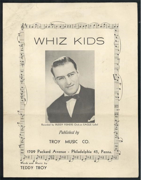 This lot contains original sheet music (1) for the song " Whiz Kids" written in honor of the 1950 Philadelphia Phillies who won Philadelphia's 1st pennant in 35 years. Also included in the lot is the original typed lyric sheet from "Whiz Kids" Victory Song to the tune of "Love Somebody". The Whiz Kids included All-Time Greats Robin Roberts & Richie Ashburn. The sheet music is in excellent condition and shows slight age discoloring. Overall EX-MT condition. The original Lyric sheet is typed and signed by the songwriters "Written by Sue Whitfield Joanie Riskin Jane Whitfield."