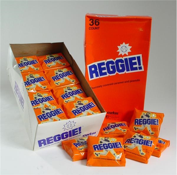 The official candy of Reggie Jackson, the self proclaimed "Straw that Stirred the Drink" for the World Champion Yankees in the late 1970's. Bright orange box reads "Reggie!" in bold blue letters.There are 36 Reggie Bars still inside of the box which shows some wear but is still intact and without major tears. Grades EX-MT.