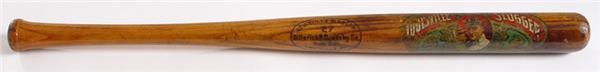 This miniature Hillerich & Bradsby Louisville Slugger bat has it's barrel decorated with a color decal of the Great Ty Cobb. The bat measures 18" in length and has a Ty Cobb decal that is 80% and stampings that are dark and well-defined. Overall appearance is EX.