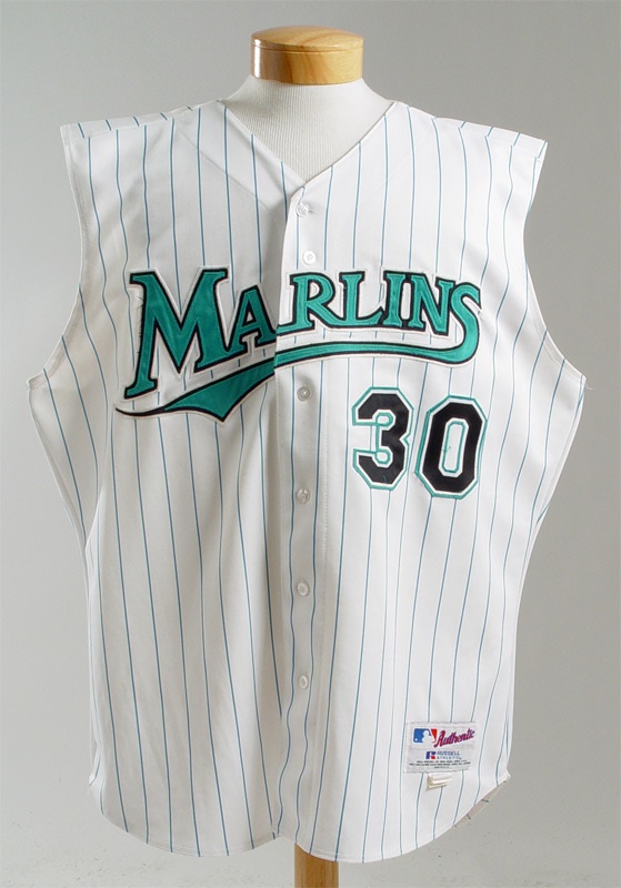 Cliff Floyd is one of the games hardest playing hard nosed players. A former # 1pick , he was a member of The Marlins 1997 World Championship Team and currently patrols LF for the NY Mets. This Russell Game Used Marlins Vest Jersey is in EX condition. The front sports "Marlins" in teal with a black trim with a three toned black on white on teal # 30. The back of the jersey is "Floyd" in black on teal and the same three tone # 30 appears as on the front only in large letters. The Flag tags on front read "Russell Authentic" with 3 smaller tags reading: "1"Extra Body Length"; "+1" Armhole Opening"; & "52 100% Polyester".