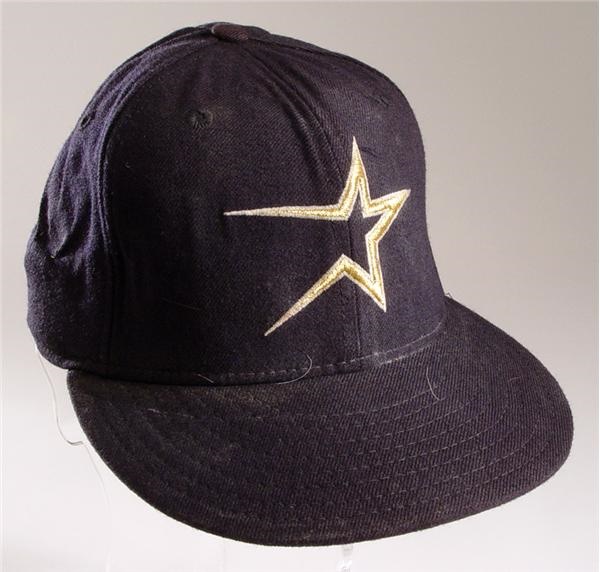 RBI's(# 5). He will join the elite 500 HR club in 2006. This Game used New ERA size 7 1/8" hat is circa 1995/96 and show heavy game use. The hat is signed "Jeff Bagwell" in blue sharpie on the underside of the bill and is marked "5" in black sharpie on the underside of the hat's bill.