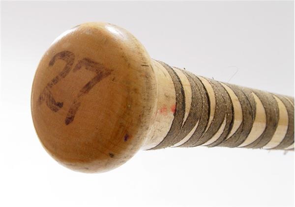 Vladimir Guerrero proved that switching leagues was easy in 2004 crushing American League pitching for 39 HR's and 126 RBI's and capturing the AL MVP Award after dominating NL pitching for 7 seasons. This Game used Zinger Model V-53 bat is from the 2001 season. The barrel head ond knob contain "27" in black sharpie. The handle is taped up 6 inches in length . There are slight traces of pine tar and the bat is cracked 3/4 way up the barrel.