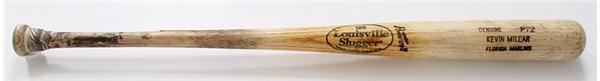 Kevin Millar was the inspirational leader in leading "2004 Red Sox Nation" to their first World Title since 1918. His steady bat and defense at 1B coupled with his positive attitude have brightened the Sox clubhouse since his 2003 off season acquistion from the Marlins. This Game Used bat is from Kevin's season with Florida. A Louisville Slugger Genuine P72 Model shows good use. The barrel head and knob are marked "15" in black sharpie. The handle shows heavy tarring , is cracked and is taped approximately 1.5" from top of knob.