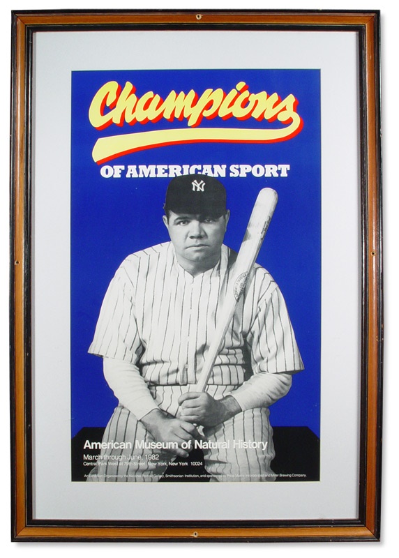 In 1982 The New York Museum of Natural History presented "The Champions of American Sport" exhihit. It covered all the greats Ali, Gehrig, Thorpe, Unitas and so on. Presented is one of the original advertising posters, The Bambino, the most recognizable sports figure in history. Only a handful exist and this example is in mint condition. The poster measures 18x30 and is framed, matted and dated March through June 1982. Great scarce Ruth piece in vivid color!!!