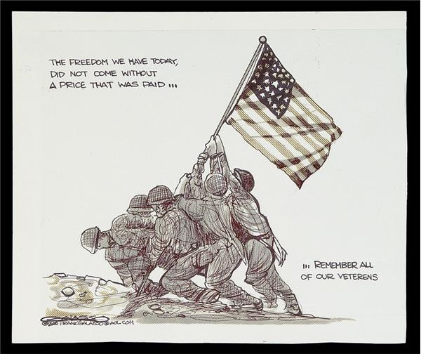 Original drawing from noted illustrator and cartoonist Frank Galasso. Drawing is from 2000 an pays tribute to all of the American Veterans who have fought bravely to defend the United States. The drawing is in MT condition and is signed and dated by the artist.