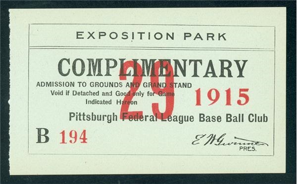 For two seasons 1914-1915 the Federal Baseball League competed as an alternative to The American & National Leagues. This upstart league vied for professional talents and acquired established professional such as Chief Bender & Joe Tinker. Exhibition Stadium home of The Pittsburgh Pirates until 1909 served as the home stadium for Federal League's Pittsburgh Rebels . This pass is for complimentary admittance to the Grounds & Grandstand. The pass measures 3.5" x 2" and is in MT condition.