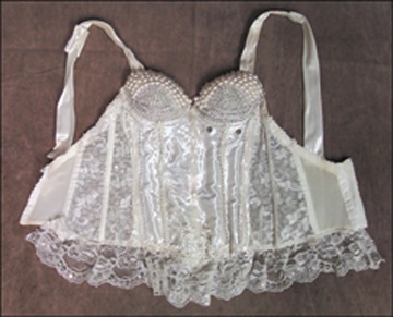 Boy, do we love material things, and our favorite Material Girl autographed this nightclub stage worn piece from her early shows in 1983. Handmade in exquisite detail with pearls, beadwork and lots of satin and lace. Naturally, has perspiration and make up stains.
