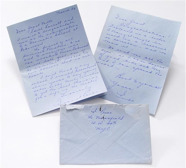 Vincent Price enjoyed a fine career in film and television that spanned 7 decades. He is remember most for his low creaky voice and contorted facial expressions that most notably in the Horror/Sci-Fi genre including the films: House of Wax;Pit and The Pendulum and The Abomindabele Dr. Phibes. This is an original letter and note written to a Grant Mills on March 26, 1942. The letter and note are written in blue ball point ink on blue unlined stationery. The lot also contains the original envelope which is postmarked NY March 28, 1942, is addressed in Price's handwriting and contains a 3c postage stamp.